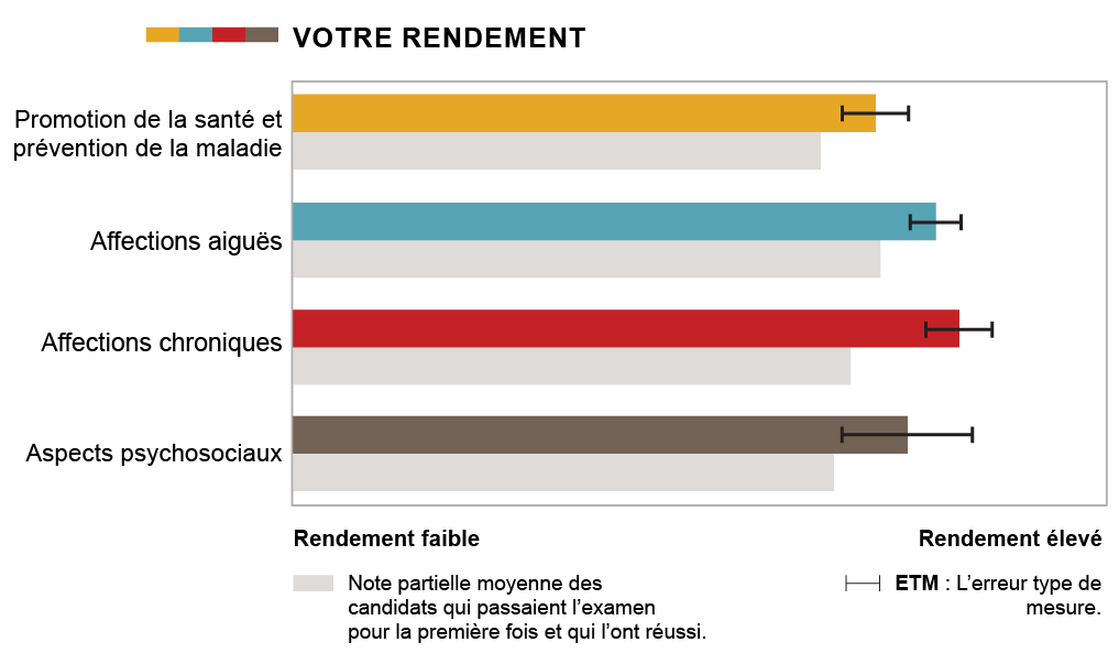 Davantage de renseignements sur les notes partielles dans divers domaines de compétences sont fournis dans le rapport d’information supplémentaire pour chaque examen. Il est à noter qu’on ne devrait pas utiliser les notes partielles qui figurent sur le rapport d’information supplémentaire pour comparer le rendement des candidats. Ces notes partielles sont fournies aux candidats, sous forme de graphique, à titre de rétroaction formative sur leurs forces et leurs faiblesses relatives, et pour qu’ils puissent les comparer avec la moyenne des notes partielles des candidats qui ont réussi l’examen à leur première tentative. Les notes partielles sont fondées sur des données considérablement moins nombreuses et, par conséquent, n’ont pas le même degré de précision que la note globale. Veuillez consulter l’exemple de graphique dans la figure ci-après pour interpréter le rapport d’information supplémentaire. Différents examens peuvent évaluer différents domaines de compétence, mais la façon d’interpréter l’information dans le rapport d’information supplémentaire est semblable d’un examen à l’autre.